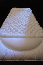 Ein ansprechendes Design war uns sehr wichtig, darum haben wir eine Spezialsteppung eigens für dieses Modell entwickelt. Einen eigenen von der Liegefläche abgetrennten und etwas erhöhten Kopf und Fußteil. Die etwas festere Steppung im Bereich des Rückens und der Beine garantiert eine bessere Anpassung an den Körper und eine bessere Luftzufuhr unter den Körper.Die Festigkeit, die diese Steppung benötigt,erreichen wir durch das Befüllen des Unterbettes mit 1300 Gramm siliconisierter Hohlfaser (Flaumfaser) bester Qualität. Spanngummis an allen vier Ecken sorgen für eine optimale Spannung des Unterbettes und verhindern zusätzlich noch ein verrutschen,was allerdings auch ohne diese Spanngummis fast unmöglich ist.